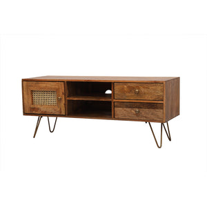 This TV unit offers ample storage with its door compartment, two drawers and shelves. The top is perfect to display decorative pieces or a TV and would look great on its own or paired with other pieces from the Rattan collection.