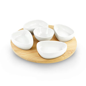 Five piece serving set consisting of 5 ceramic bowls and a bamboo tray. Perfect for serving appetisers, side dishes, tapas or sauces. The bowls are removable so are easy to clean after use and store. Whether you're entertaining guests or preparing snacks, this set offers a stylish and dependable way to serve up your favourite dishes.